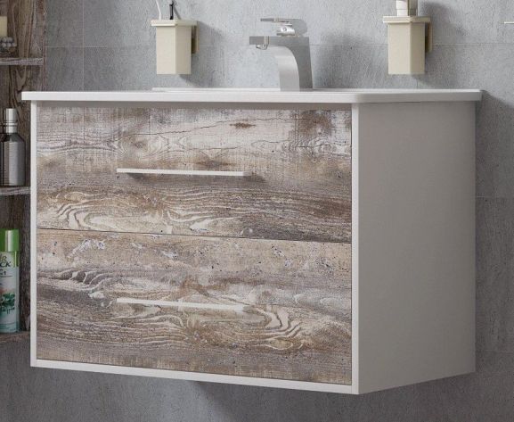 Подвесная тумба оснащена двумя выдвижными ящиками. Верхний ящик высотой 70 мм с выпилом под коммуникации, нижний - высотой 160 мм. Для крепления к стене используются подвесы "Scarpi". Боковины и низ тумбы в белой глянцевой эмали. Фасады выполнены из текстурных материалов. Ручки - по центру фасадов.