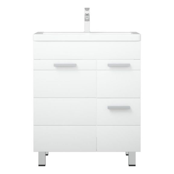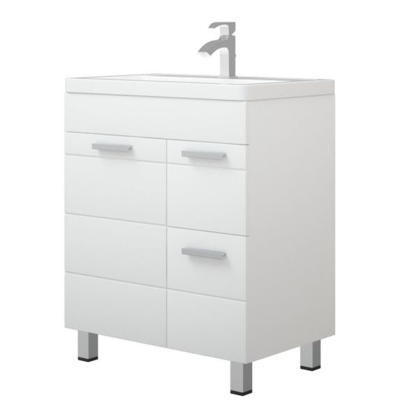 Коллекция "Денвер" - это вдохновление четкостью линий модернизма! Линейка выполнена из влагостойкого МДФ, покрытого белой глянцевой пленкой. Мебель комплектуется фурнитурой высокого качества, дверными петлями со встроенными доводчиками и удобными наклонными ручками. Линейная фрезеровка на фасадах придаст индивидуальность и задаст особый ритм Вашей ванной комнате. У тумбы слева - большая дверь, справа - 2 выдвижных ящика. Ящики на шариковых направляющих, высота ящиков - 160 и 250 мм. Петли на двери - с доводчиками. У тумбы 3 опоры. Коромысло, дверь, фасады ящиков - МДФ в плёнке белой, корпус - ЛДСП.