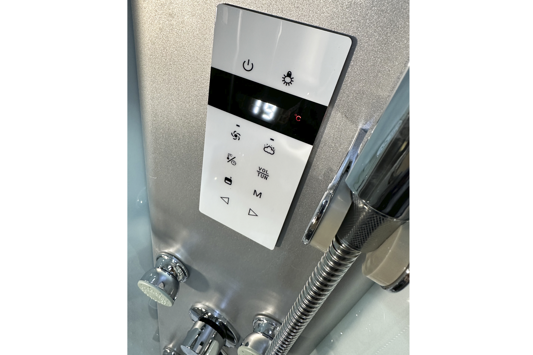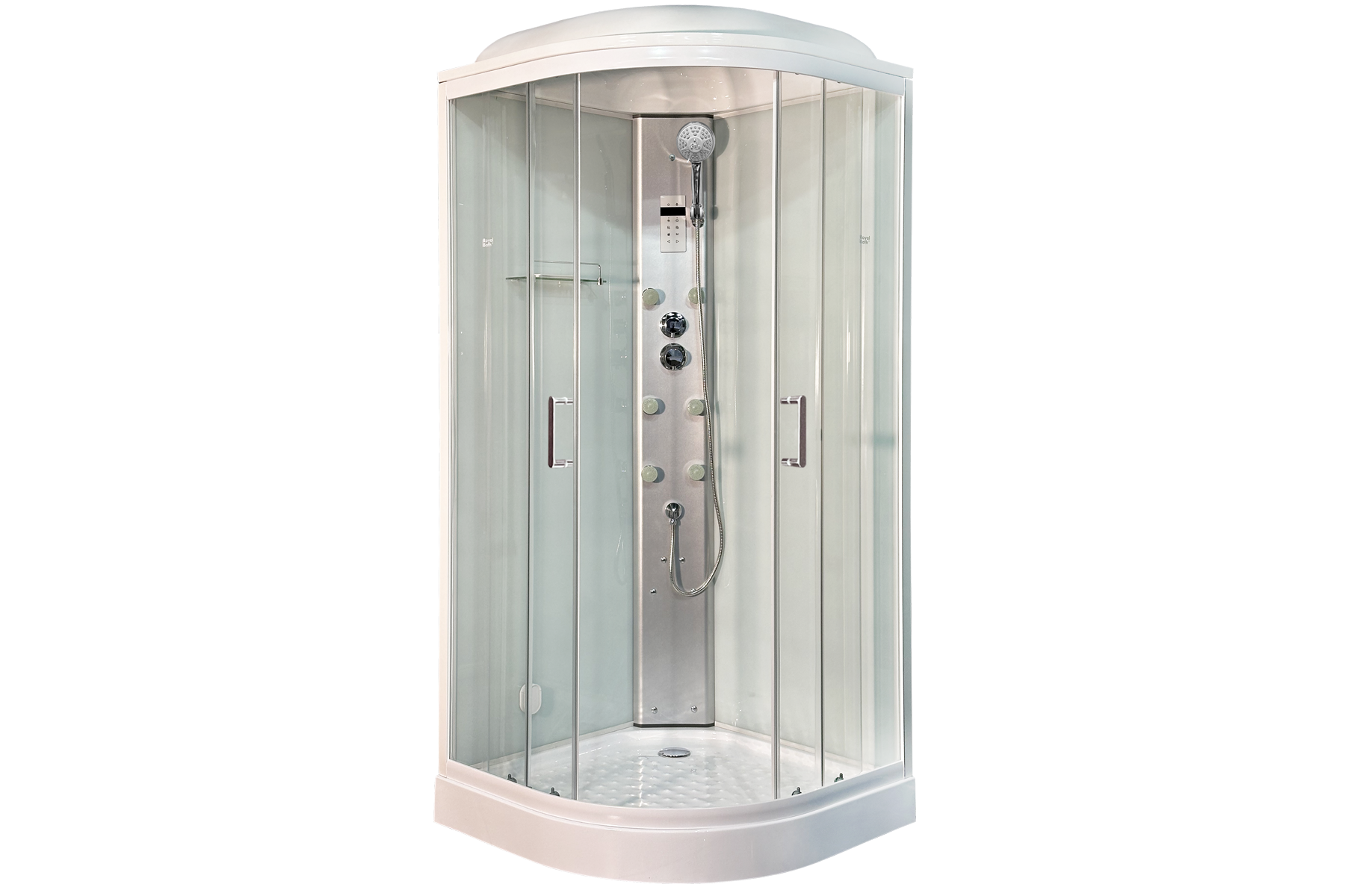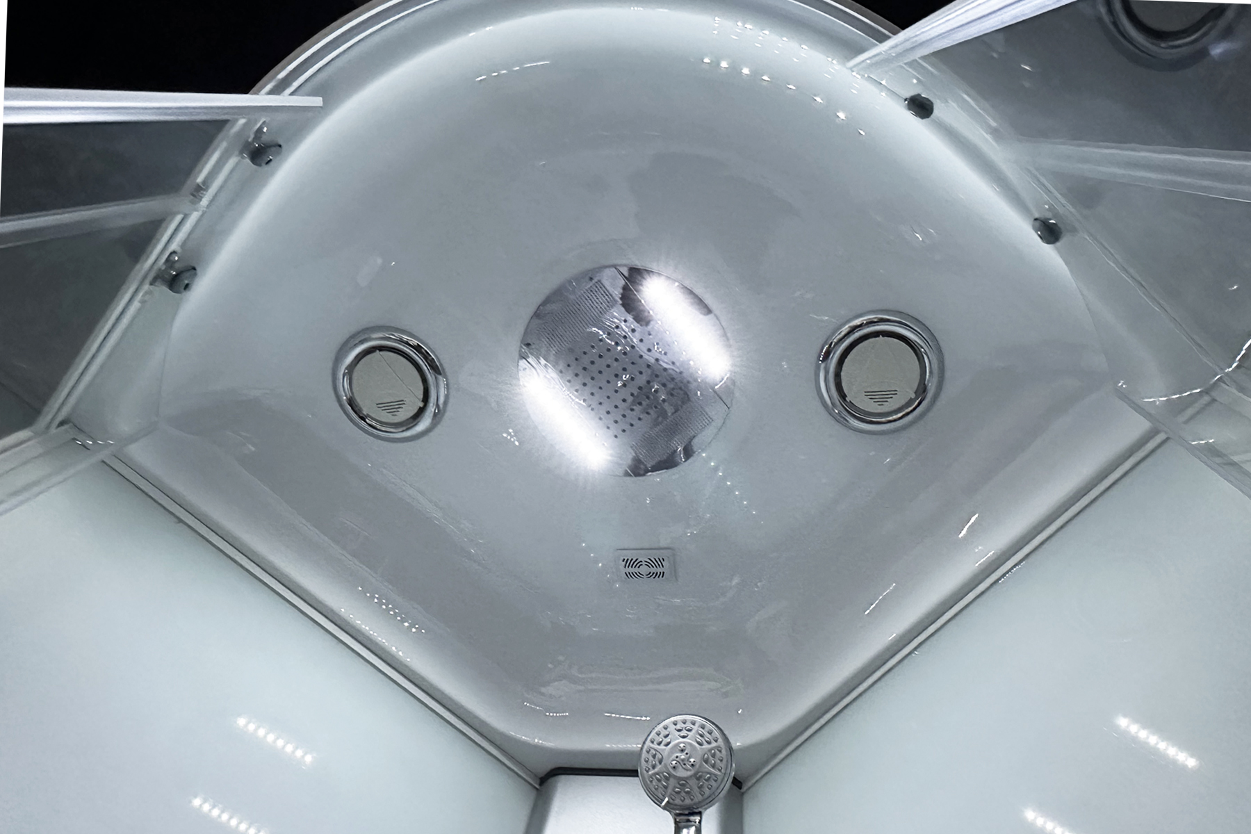 Оснащение озонация,bluetooth, радио, подсветка, вытяжной вентилятор, парогенератор (турецкая баня), стеклянная полочка, смеситель, сифон
