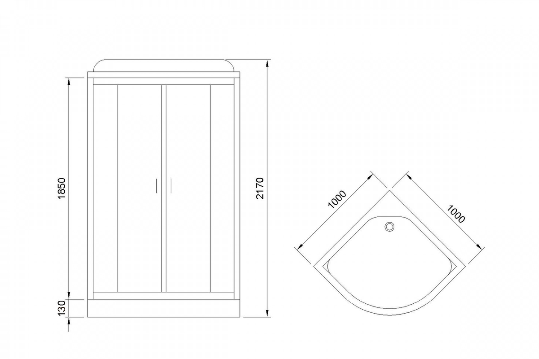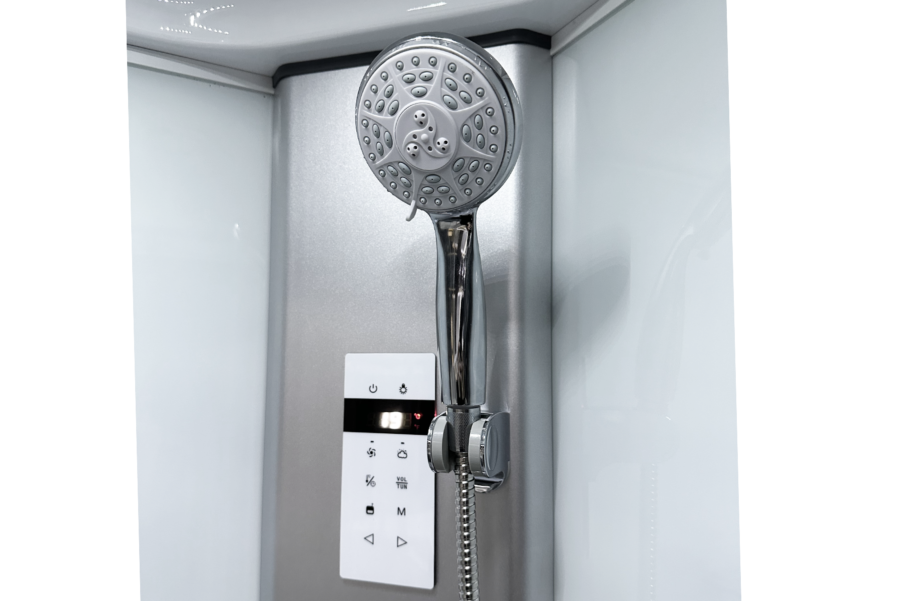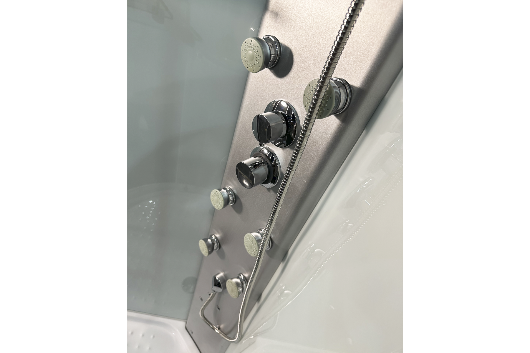 Оснащение озонация,bluetooth, радио, подсветка, вытяжной вентилятор, парогенератор (турецкая баня), стеклянная полочка, смеситель, сифон