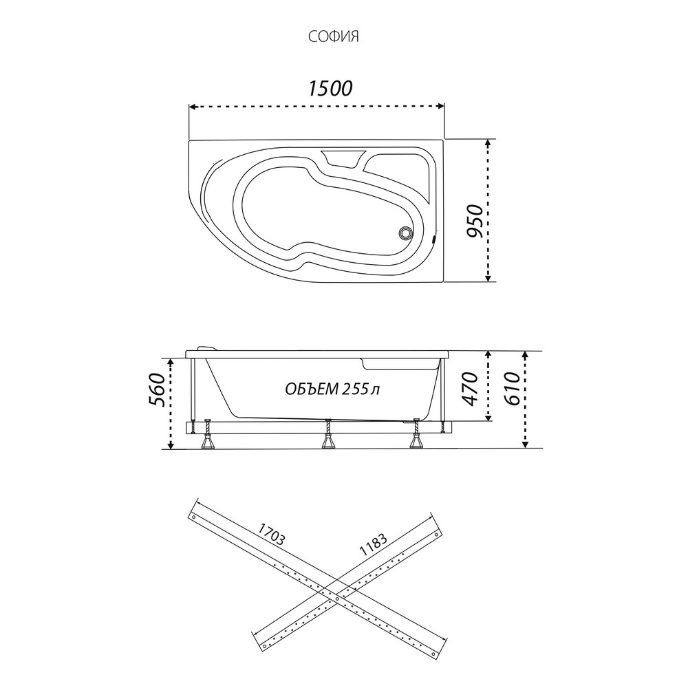 Размеры: Длина: 1500 мм Ширина: 950 мм Высота: 610 мм Форма: Прямоугольная. Материал: Акрил (Senosan)